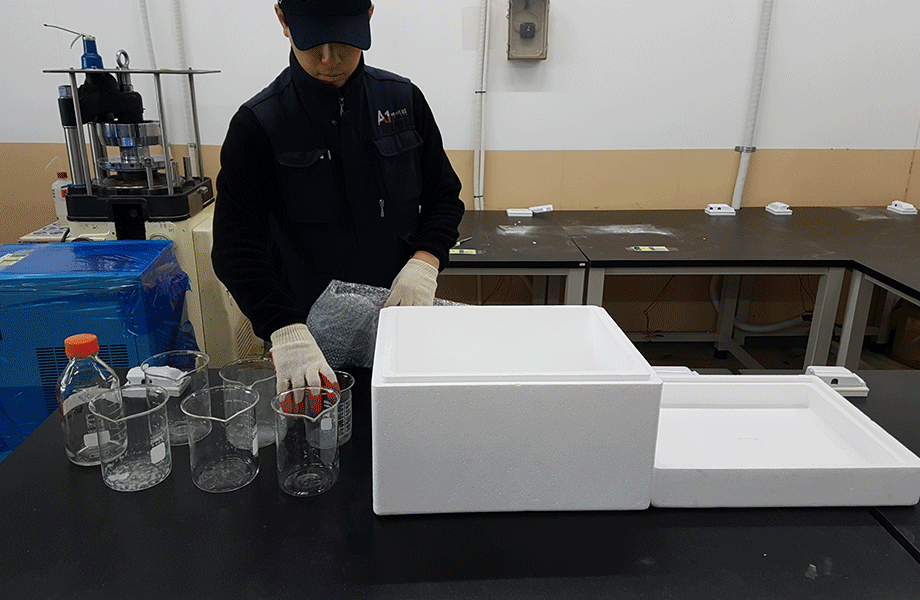 시약/초자류깨지기 쉬운 물품으로 에어캡을 이용 개별 포장후 바구니 또는 아이스박스 에 담아 포장완료